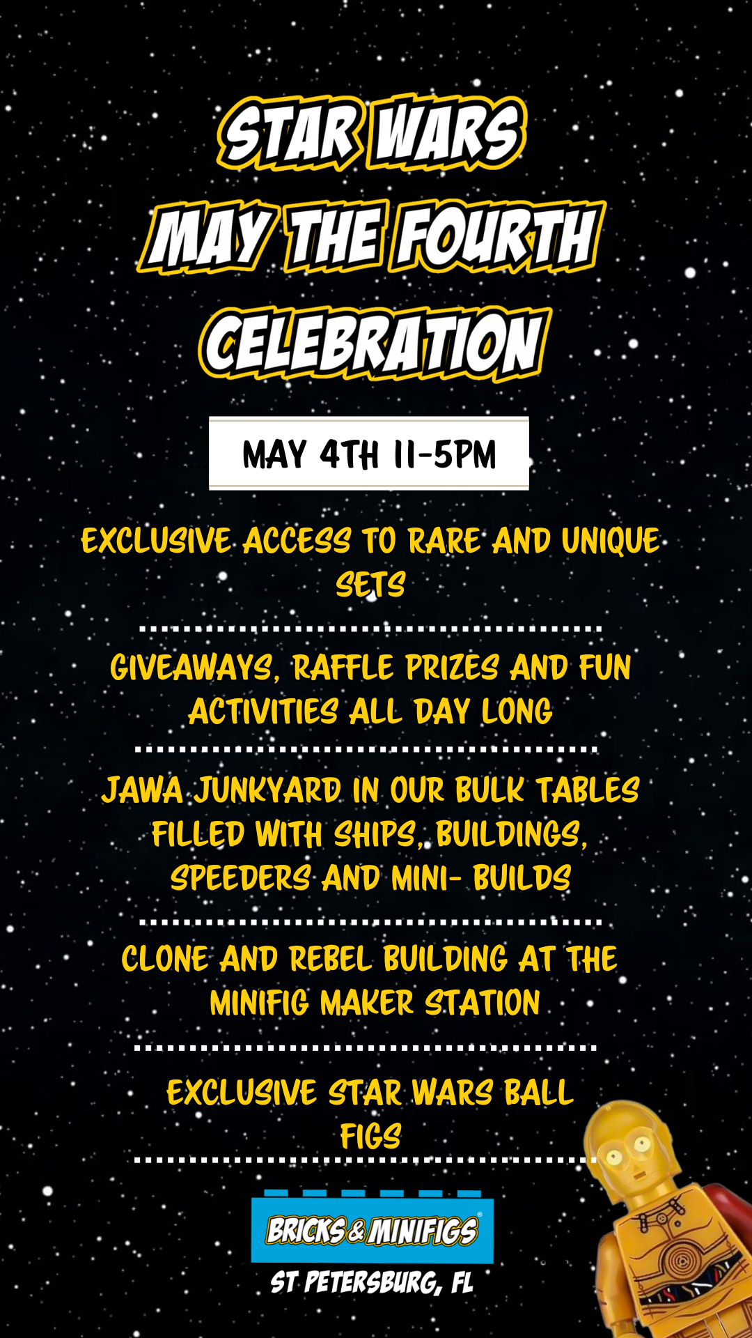 Whether you align with the light side or the dark side, we have something for everyone. Dress up as your favorite character and join fellow fans for a day of epic fun.See you there, and until then, keep building the galaxy!
