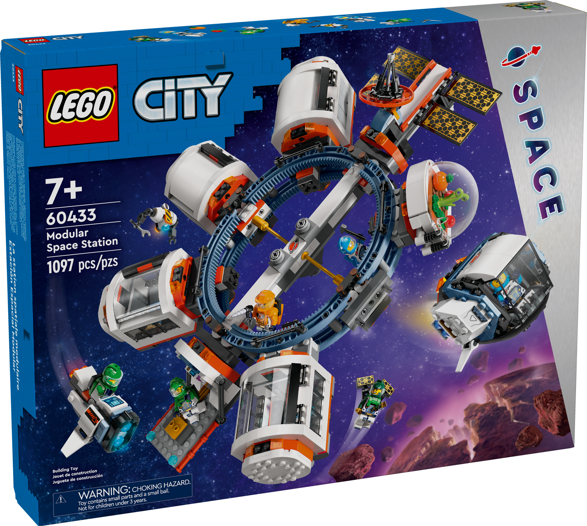 Join the space crew aboard the LEGO® City Modular Space Station. This futuristic space ring is an orbiting anchor for docking spacecraft and room pod modules, including a satellite, space bike, shuttle, science lab, repair workshop, kitchen, sleeping quarters and a biodome. Switch the modules around to create your own space station design or join them to the shuttle to form a cool space train!
